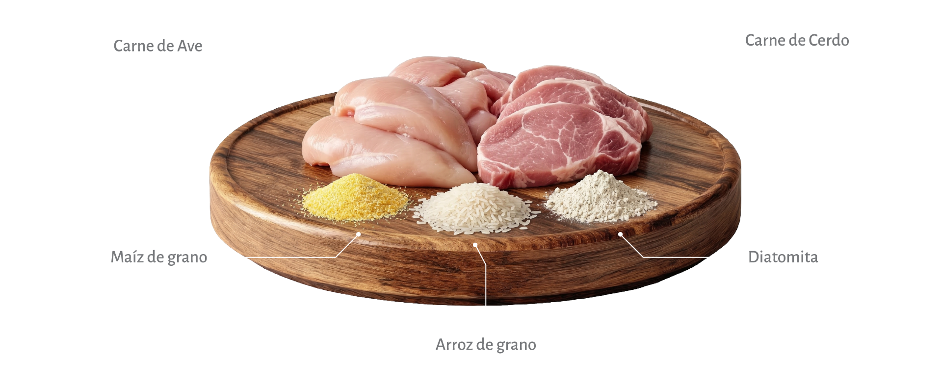 Carne ave y cerdo 38%, maíz de grano molido 31%, Arroz de grano 10% aceite de pavo 7%, Coseta de remolacha 2%, Diatomita, blend de aceite, omega 3 y 6, hidrolizado de hígado, L-Carnitina, betaglucanos, levadura de cerveza, vitaminas y minerales de acuerdo con las tablas de requerimientos NRC y AAFCO.