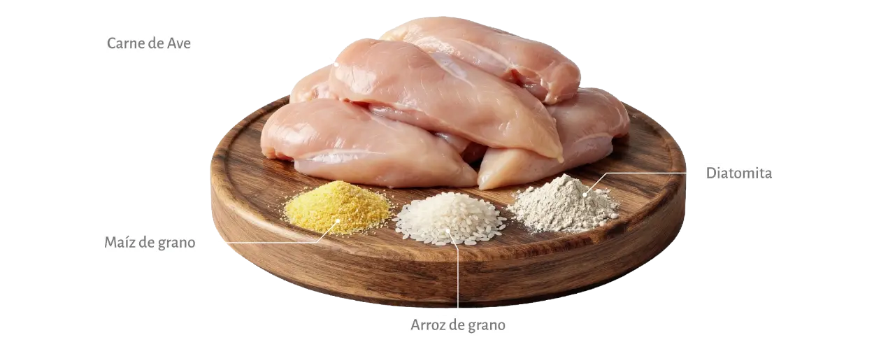 Proteína de ave 38%, Maíz de grano molido 22%, Arroz de grano 15%, aceite de pavo 10%, hidrolizado de salmon 2.5%, tomasa de solanácea 2 %%, diatomita 1,5%, blend marino de omega 3, 6, 9 con EPA y DHA, plasma sanguíneo deshidratado en spray, hidrolizado de hígado, L-Carnitina, betaglucanos, levadura de cerveza, Semilla de lino, maqui deshidratado, FOS y MOS, cúrcuma en polvo, sulfato de condroitina y glucosamida, Piperina, vitaminas A, D3, E, K3, B1, B2, B6, B12, Biotina y Niacina (B3), Colina, minerales orgánicos, ácidos orgánicos, Se++ como bioselenio. Alimento según requerimientos basados en las tablas del N.R.C., AAFCO. de Norteamérica